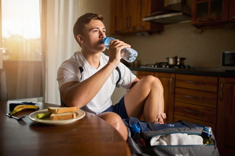 Ne commettez pas l’erreur d’attendre la soif. L’hydratation doit être gérée bien en amont : buvez de l’eau régulièrement, par petites quantités, tout au long de la journée. Arriver déshydraté, c’est saboter votre alimentation avant match de football et partir avec un handicap.